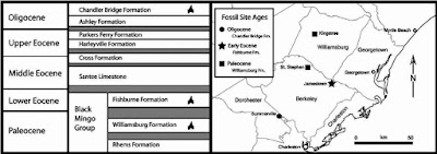 The Charleston Embayment is a geological term referring to a thickening of sedimentary rocks on the central South Carolina coast. In deposits of the Atlantic Coastal Plain, the strata thicken in embayments and tend to extend further inland and are separated by “arches” – somewhat uplifted regions where the strata thin towards. The Charleston embayment transitions to the Cape Fear Arch in the area around Wilmington, North Carolina, and to the north lies the Albemarle Embayment where the famous phosphate deposits of the Lee Creek mine were deposited (the Salisbury embayment in Virginia and Maryland hosts the famous Calvert Formation). Deposits in the Charleston embayment are Cenozoic (65 million years or younger) and typically marine. There are some laterally discontinuous Paleocene deposits with fossils, but the story really begins in the Eocene. Close to Charleston, Eocene deposits include the lower Eocene Fishburne Formation (the only well-published Eocene shark assemblage in South Carolina), the Santee Limestone (mid Eocene), the Cross and Pregnall members of the Tupelo Bay Formation (mid and late Eocene, respectively), and the Cooper Group: the thin Harleyville and Parkers Ferry formations (late Eocene).